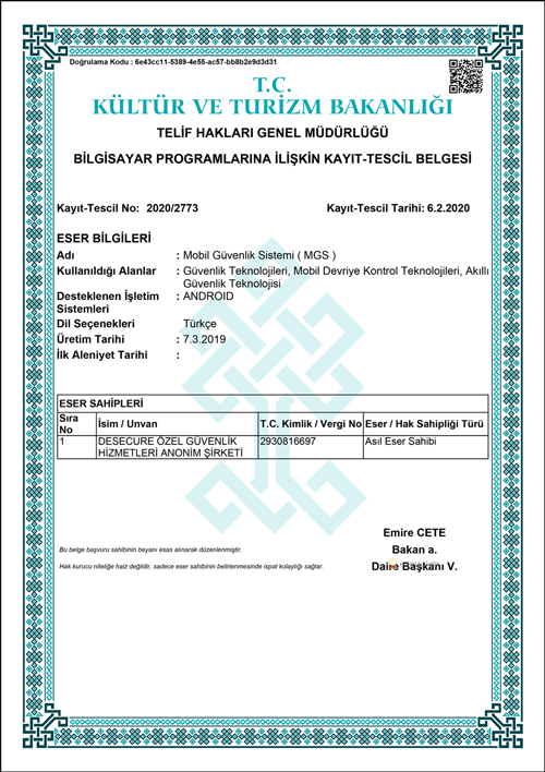 Mobil Güvenlik Sistemi kendi bünyemiz de bulunan ARGE ekibimiz tarafından tasarlanmış ve oluşturulmuştur. Mobil Güvenlik Sistemini oluşturduğumuz tarihten itibaren sürekli iyileştirmeye gidilmiştir ve geliştirilmeye devam edilmektedir. Mobil Güvenlik Sisteminin telif hakları tarafımıza aittir.
